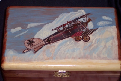 Here is a great gift idea for those WWII buffs. Great German War Plane in the sky. Design is woodburned in by hand, colors are brought in with oil pencils. We offer a free inscription on the inside top.