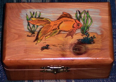 This little goldfish is so cute. He is looking for that perfect home. This design makes a great gift for any occasion. The design is woodburned by hand and oil pencil is used for color. We offer a free inscription on the inside lid of all our products.