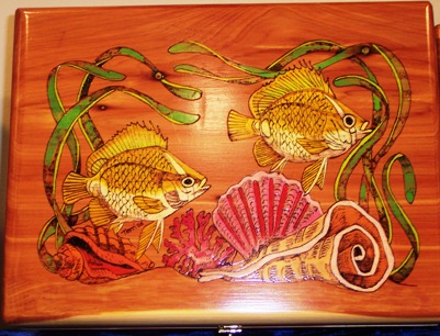 This is a wonderful ocean scene, full of soft colors that compliment the woodgrain of our Cedar products. The design is woodburned by hand and oil pencil is used for color. We offer a free inscription on the inside lid of all our products.
