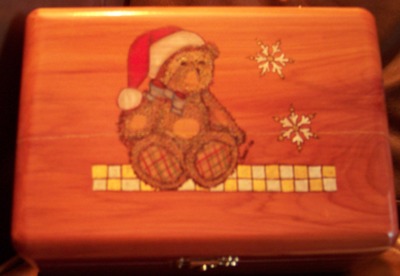 This darling teddy is all decked out for the holidays. He even has his own snowflakes. This makes a great gift for young or old for any occasion. he design is woodburned by hand and oil pencil is used for color. We offer a free inscription on the inside lid of all our products.