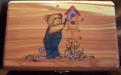 This Teddy is preparing for Spring, sprucing up the bird house for the summer renters. There is a wonderful Spring theme with flowers and birds. Makes a great gift for any occasion. he design is woodburned by hand and oil pencil is used for color. We offer a free inscription on the inside lid of all our products.