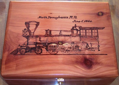 This Old Pennsylvania Engine is one of the antique engines we have done. They seem to spark interest amongst the young and old alike. Makes a great gift for any occassion. The design is woodburned by hand and oil pencil is used for color. We offer a free inscription on the inside lid of all our products.