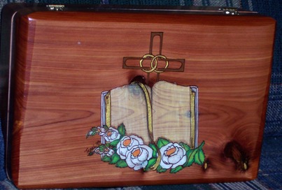 This Design is a great Wedding Gift. The design holds all the traditional symbols of marriage, never ending circle of love; represented by the wedding bands on the cross - Keeping God in you life ; represented by the bible and cross - and the purity of the day respresented by the white cabbage roses. Very popular wedding gift alone, or slip in a gift certificate for a gift of their choosing and it becomes a keepsake gift that will last for generations to come. The design is woodburned by hand and oil pencil is used for color. We offer a free inscription on the inside lid of all our products.