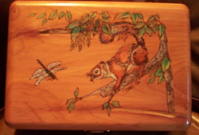 Our playful squirrel is having fun with his dragonfly friend during a warm summer day. This design is popular for both young and old. Makes a great gift for any occasion. The design is woodburned by hand and oil pencil is used for color. We offer a free inscription on the inside lid of all our products.