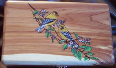 This unique design is available in all sizes of our Handcrafted Keepsake Boxes as well as all of our Handcrafted Cedar Chests. The design is hand woodburned and the color is applied by hand with oil pencil. Using oil pencil allows the grain of the wood to show through the design. Our Handcrafted Keepsake Boxes as well as our Handcrafted Cedar Chests make great Retirement Gifts, Birthday Gifts, Christmas Gifts, Anniversary Gifts, Graduation Gifts, or any occassion gifts. Put your FREE personal message on the inside cover of our Handcrafted Keepsake Boxes or Handcrafted Cedar Chests and you have a gift that will be cherished forever as a unique and personal one of a kind gift.