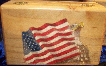This is one of our best sellers. This pattern includes an American Flag and Eagle. The design is woodburned in by hand, color is added by hand with oil pencil. We offer a free inscription on the inside lid of box.
