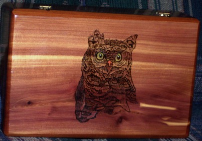 We call him Hoot!!!! He is a beautiful woodburned owl with very little color added for just the right accents. He would be a perfect addition to any hunting cabin, or country home. We offer a free woodburned inscription on the inside lid of all our products.