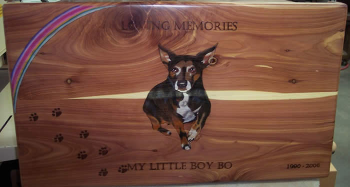 This was a custom order we did for a family who lost their friend. It has many elements to the design- the picture, the name, the rainbow, and the paw prints to the rainbow. We can recreate any family friend to this design. The design is woodburned in by hand and then oil pencil is used for color. We offer a free inscription on the inside lid of box.