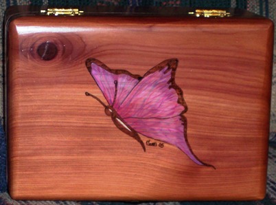 This butterfly is soft and airy. She almost feels like she if floating across the cedar. The colors compliment each other very well. The design is woodburned by hand, color is brought up with oil pencils. We offer a free inscription on the inside lid of all our products.