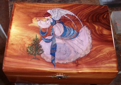 Our Christmas Angel is made up of soft white and blues. The colors perfectly compliment the Cedar wood. She is soft and gives a feel she is gently floating across the Keepsake box. The design is woodburned by hand and oil pencil is used for the color. We offer a free woodburned inscription on the inside lid of all our products.