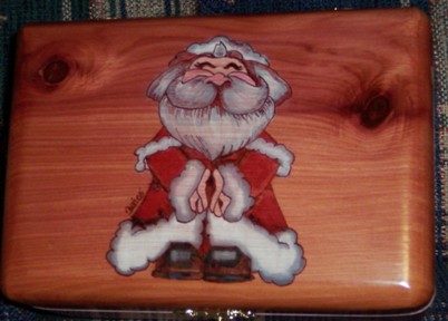 This Santa Design is so charming you will just have to take him home. Loaded with detail this design is woodburned by hand and oil pencil used for color. He will make a great addition to any room in your home. We offer a free woodburned inscription on the inside lid of all our products.