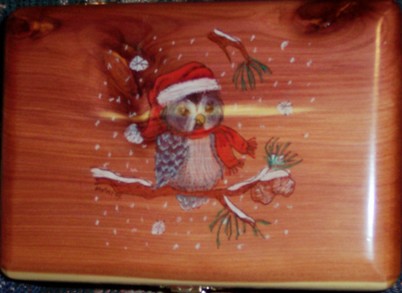 This is a cute little owl caught out in a mid-winters storm. He is so adorable anyone would enjoy owning this wonderful gift. The softer colors really compliment the cedar wood, and the design gives you the feel of that winter storm. The design is woodburned by hand and oil pencil used for color. We offer a free inscription on the inside lid of all our products.