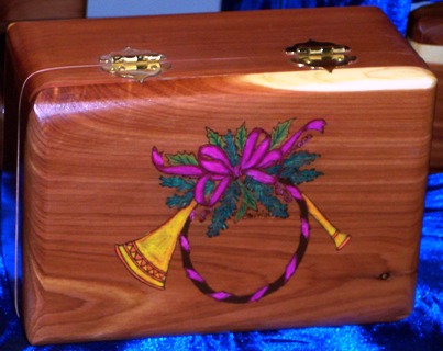 This unique design is available in all sizes of our Handcrafted Keepsake Boxes as well as all of our Handcrafted Cedar Chests. The design is hand woodburned and the color is applied by hand with oil pencil. Using oil pencil allows the grain of the wood to show through the design. Our Handcrafted Keepsake Boxes as well as our Handcrafted Cedar Chests make great Retirement Gifts, Birthday Gifts, Christmas Gifts, Anniversary Gifts, Graduation Gifts, or any occassion gifts. Put your FREE personal message on the inside cover of our Handcrafted Keepsake Boxes or Handcrafted Cedar Chests and you have a gift that will be cherished forever as a unique and personal one of a kind gift.