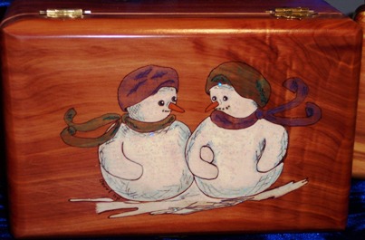 Our snowpeople are ready to celebrate the winter season. All decked out in their hats and scarves. The design is woodburned by hand and oil pencil used for color, and these two even carry a hint of glitter to give them that snowy look. We offer a free woodburned inscription on the inside lid of all of our products.