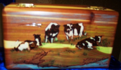 Although very similar to the other cow pattern, this pattern has softer colors, and a bit different playment of the cows. This is a great gift for that cow lover, or farm lover on your list. The design is woodburned by hand and oil pencil used for color. We offer a free woodburned inscription on the inside lid of all our products.