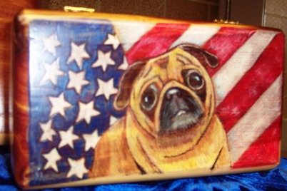 This design is bold in color yet soft in features with our little Pug. This little guy is just waiting for that right home to make you proud. The design is woodburned by hand and oil pencil used for color. Makes a great gift for an office or home. We offer a free woodburned inscription on the inside lid of all our products.