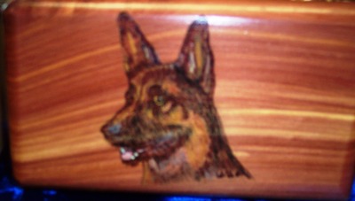 He's very smart and handsome in design. This German Shepherd is a designed that is all woodburned by hand with just a slight bit of color to bring in special features. He is a welcome addition for any dog lover. We offer a free woodburned inscription on the inside lid of all our products.