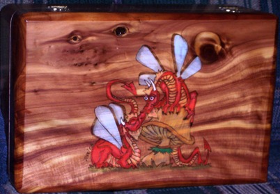 We got alot of requests for dragons. So we have delivered. This is a design of a sweet dragon couple falling in love. A perfect mix of color against the cedar wood. The colors are soft enough they blend with the grain of the wood. The design is woodburned by hand and oil pencil is used for the color. We offer a free woodburned inscription on the inside lid of all our products.