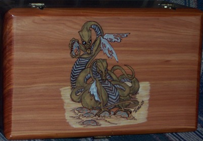 This dragon design is sleek and fun. Two dragons are protecting their eggs. Colors are silver and gold. This design is perfect for those dragon collectors. The design is woodburned by hand and oil pencil is used for color. We offer a free inscription on the inside lid of all our products.