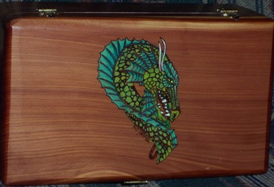 This dragon design comes right out of the castle. He is a traditional style dragon with deep rich colors accenting his scales and face. He is a perfect addition for any dragon collector. The design is woodburned by hand and oil pencil is used for the colors. We offer a free woodburned inscription on the inside lid of all our products.