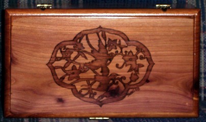 This unique design is available in all sizes of our Handcrafted Keepsake Boxes as well as all of our Handcrafted Cedar Chests. The design is hand woodburned and the color is applied by hand with oil pencil. Using oil pencil allows the grain of the wood to show through the design. Our Handcrafted Keepsake Boxes as well as our Handcrafted Cedar Chests make great Retirement Gifts, Birthday Gifts, Christmas Gifts, Anniversary Gifts, Graduation Gifts, or any occassion gifts. Put your FREE personal message on the inside cover of our Handcrafted Keepsake Boxes or Handcrafted Cedar Chests and you have a gift that will be cherished forever as a unique and personal one of a kind gift.