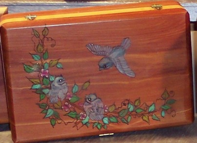 This unique design is available in all sizes of our Handcrafted Keepsake Boxes as well as all of our Handcrafted Cedar Chests. The design is hand woodburned and the color is applied by hand with oil pencil. Using oil pencil allows the grain of the wood to show through the design. Our Handcrafted Keepsake Boxes as well as our Handcrafted Cedar Chests make great Retirement Gifts, Birthday Gifts, Christmas Gifts, Anniversary Gifts, Graduation Gifts, or any occassion gifts. Put your FREE personal message on the inside cover of our Handcrafted Keepsake Boxes or Handcrafted Cedar Chests and you have a gift that will be cherished forever as a unique and personal one of a kind gift.