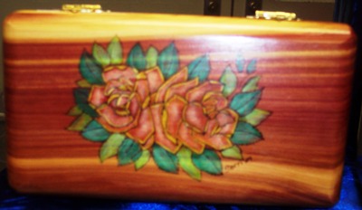 These Victorian Era roses make a perfect gift for anyone who loves Victorian themed decorations. These roses are a soft orange with yellow highlights, bringing it all together is the soft greens of the leaves. The design is woodburned by hand and oil pencil used for color. We offer a free inscription on the inside lid of all our products.
