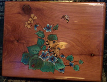 This unique design is available in all sizes of our Handcrafted Keepsake Boxes as well as all of our Handcrafted Cedar Chests. The design is hand woodburned and the color is applied by hand with oil pencil. Using oil pencil allows the grain of the wood to show through the design. Our Handcrafted Keepsake Boxes as well as our Handcrafted Cedar Chests make great Retirement Gifts, Birthday Gifts, Christmas Gifts, Anniversary Gifts, Graduation Gifts, or any occassion gifts. Put your FREE personal message on the inside cover of our Handcrafted Keepsake Boxes or Handcrafted Cedar Chests and you have a gift that will be cherished forever as a unique and personal one of a kind gift.