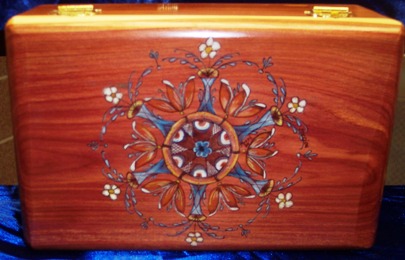 This unique design is available in all sizes of our Handcrafted Keepsake Boxes as well as all of our Handcrafted Cedar Chests. The design is hand woodburned and the color is applied by hand with oil pencil. Using oil pencil allows the grain of the wood to show through the design. Our Handcrafted Keepsake Boxes as well as our Handcrafted Cedar Chests make great Retirement Gifts, Birthday Gifts, Christmas Gifts, Anniversary Gifts, Graduation Gifts, or any occassion gifts. Put your FREE personal message on the inside cover of our Handcrafted Keepsake Boxes or Handcrafted Cedar Chests and you have a gift that will be cherished forever as a unique and personal one of a kind gift.