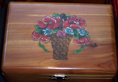 Our flower basket design is a perfect blend of depth and color. Reminds you of when you are in your flower garden carefully choosing the flowers to cut and bring inside to enjoy. The design is woodburned by hand and oil pencil is used for color. We offer a free inscription on the inside lid of all our products.