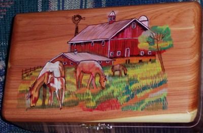 This design holds two different parts, the horses and the actual barn. Alot of color is added to create this design, very simple in form but an excellent gift for anyone who enjoys the farm life. The design is woodburned by hand and oil pencil used for color. We offer a free inscription on the inside lid of all our products.