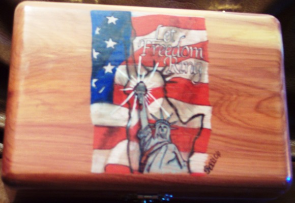 Lady Liberty has always been a symbol of our Freedom. This design was created to remind us all that freedom does have a cost. Let Freedom ring shows our pride in America, and makes a great gift for any occasion. The design is woodburned in by hand and then oil pencil is used for color. We offer a free inscription on the inside lid of box.