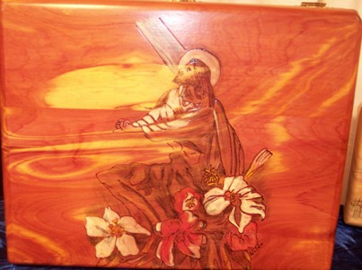 This design is our most popular. Jesus kneeling down at the rock. Makes a perfect gift for any occassion. The design is woodburned by hand and oil pencil is used for color. We offer a free inscription on the inside lid of all our products.