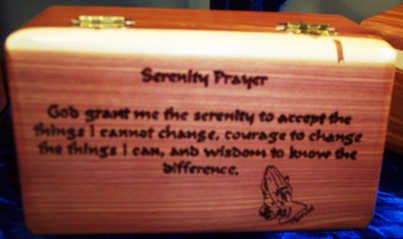 The Serenity Prayer is always popular. This is a great gift for any reason or occassion. The design is woodburned by hand. We offer a free inscription on the inside lid of all our products.