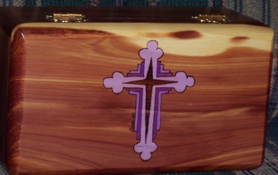 This is one of our most elegant crosses. The soft lines with the deep color behind the lighter colors. Makes a great gift for any occasion. The design is woodburned by hand and oil pencil is used for color. We offer a free inscription on the inside lid of all our products.