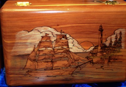 This is another favorite amongst our nautical friends. The scene has high contrast with woodburning vs color. Great gift for any occasion. The design is woodburned by hand and oil pencil is used for color. We offer a free inscription on the inside lid of all our products.