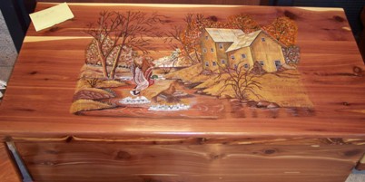 This scene is next popular especially with the men. This is a fall scene with ducks landing on a stream. The colors are perfect to match with the cedar colors and grain. Makes a great gift for any occasion. The design is woodburned by hand and oil pencil is used for color. We offer a free inscription on the inside lid of all our products.
