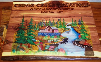 This was a custom job we did for a business sign. The design has deep rich colors that compliment the cedar grain perfectly. Add this scene to a Cedar Chest and it makes the perfect gift for any occasion.The design is woodburned by hand and oil pencil is used for color. We offer a free inscription on the inside lid of all our products.