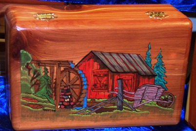 This is a slight variation in our barn, we added a water wheel and a stream. It hold bright bold colors and makes the perfect gift for any occasion. The design is woodburned by hand and oil pencil is used for color. We offer a free inscription on the inside lid of all our products.