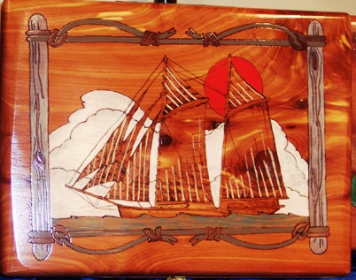 This is a very popular design. The inverted colors of the ship and the nautical theme makes this a great gift for any occasion. The design is woodburned by hand and oil pencil is used for color. We offer a free inscription on the inside lid of all our products.