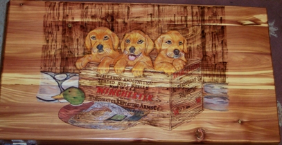 This design is one of the cutiest we have done. We saw this limited addition print during a show we were attending, we approached the artist to ask for permission to recreate this on one of our small cedar chests. A bit of bargining and we got the release. This is overall out most popular design for our Cedar Chests. Once the artist saw what we did, he agreed that with the purchase of any of our Cedar Chests with this design we would be able to offer our customers one of his prints of this design. This design is woodburned by hand and oil pencil used for the color. We offer a free woodburned inscription on the inside lid of all our products.