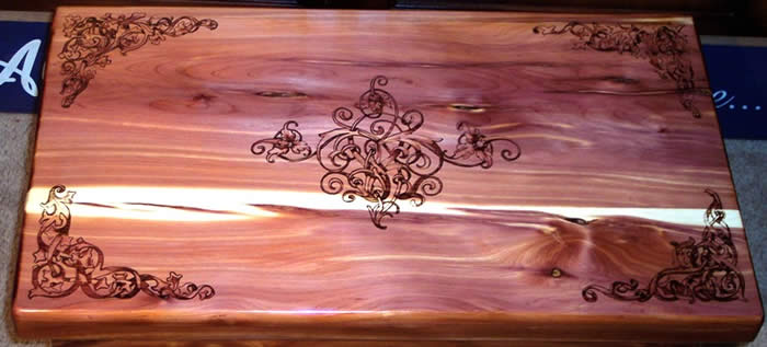 This unique design is available in all sizes of our Handcrafted Keepsake Boxes as well as all of our Handcrafted Cedar Chests. The design is hand woodburned and the color is applied by hand with oil pencil. Using oil pencil allows the grain of the wood to show through the design. Our Handcrafted Keepsake Boxes as well as our Handcrafted Cedar Chests make great Retirement Gifts, Birthday Gifts, Christmas Gifts, Anniversary Gifts, Graduation Gifts, or any occassion gifts. Put your FREE personal message on the inside cover of our Handcrafted Keepsake Boxes or Handcrafted Cedar Chests and you have a gift that will be cherished forever as a unique and personal one of a kind gift.