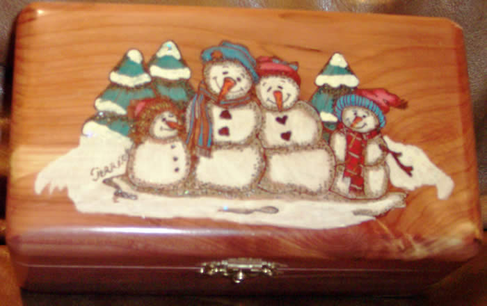 Our snow family is all decked out and ready for some winter fun. This design takes us all back to the days we prayed for snow and a day off from school. Makes a great gift for any occasion. The design is woodburned in by hand and then oil pencil is used for color. We offer a free inscription on the inside lid of box.