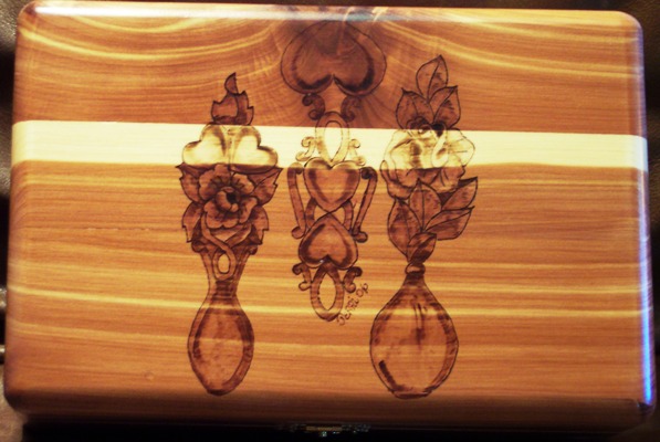 This is a Welsh Spoon design. These spoon are usually handcarved and have meanings behind each one. We enjoy gfts that have meanings beyond the actual gift itself so this design was introduced in late 2007. It has become one of the overall most popular designs of 2007. The design is woodburned in by hand and then oil pencil is used for color. We offer a free inscription on the inside lid of box.