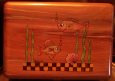 Our fun goldfish bowl is a great gift for young and old alike. The two goldfish swim around the bit of plantlife and shell that is in their bowl. Great gift for any occasion. The design is woodburned by hand and oil pencil is used for color. We offer a free inscription on the inside lid of all our products.
