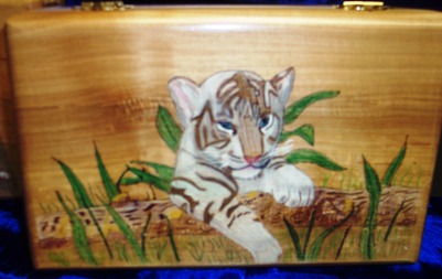 Our Baby White Tiger is just wanting a home to call it's own. This white tiger takes advantage of all aspects, woodburning, using the grain of the wood in part of the design, and colors. This makes an excellent gift for any occasion. The design is woodburned by hand and oil pencil is used for color. We offer a free inscription on the inside lid of all our products.