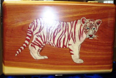 This adult white Tiger is very majestic. He is very popular amongst young and old. Makes a great gift for any occasion. The design is woodburned by hand and oil pencil is used for color. We offer a free inscription on the inside lid of all our products.