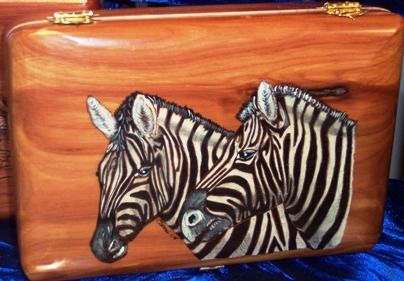 Our Zebra design is very majestic. They are very popular with young and old alike. The are a perfect gift for any occasion. The design is woodburned by hand and oil pencil is used for color. We offer a free inscription on the inside lid of all our products.